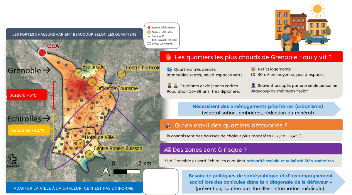 Dans le cœur très dense de Grenoble, les nuits estivales montrent un écart de +3 à +4,8°C par rapport aux zones rurales de référence. Population jeune, diplômée, cadres supérieurs, logements de petite superficie… Ce portrait ne correspond pas du tout à l'image mentale que l'on se fait de la « vulnérabilité climatique ».